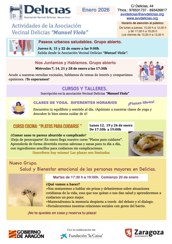 Aldeas Infantiles, ASAPME, Asociación Vecinal Delicias “Manuel Viola”, Centros de Convivencia de Mayores: Delicias, Ciudad Jardín y Terminillo;  Centro Socio Laboral (ADUNARE), Centros Municipales de Servicios Sociales Delicias 1 y 2, Centros de salud Delicias Norte, Delicias Sur, Bombarda y Univérsitas; Centros educativos Infantil y Primaria  Andres Manjón y Jose Mª Mir; Institutos Secundaria El Portillo y Jerónimo Zurita;  Colegio Salesianos, Cáritas, Fundación Cruz Blanca, Fundación Adunare, Fundación Atención temprana, YMCA.