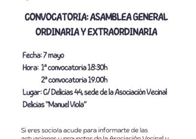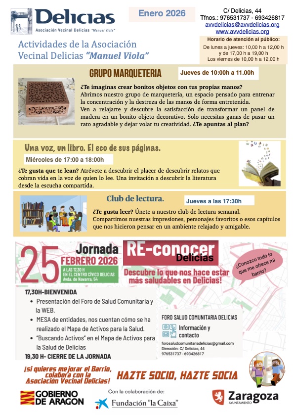 El Foro de salud comunitaria Delicias está formado por entidades públicas  y sociales, que trabajamos para generar entornos saludables, que mejoren la calidad de vida y del bienestar emocional de los vecinos y vecinas. Este año hemos realizado el mapeo de activos del barrio que se presentará el viernes día 10 de Mayo de 2024, en la FERIA DE SALUD COMUNITARIA DE DELICIAS. Distintos grupos de jóvenes, adultos y mayores hemos salido al barrio a identificar las riquezas y los recursos que hay y que nos generan salud, ha sido un proceso participativo y centrado en lo que nos hace estar sanos. El resultado lo podéis consultar en el siguiente enlace: MAPA DE ACTIVOS DE DELICIAS