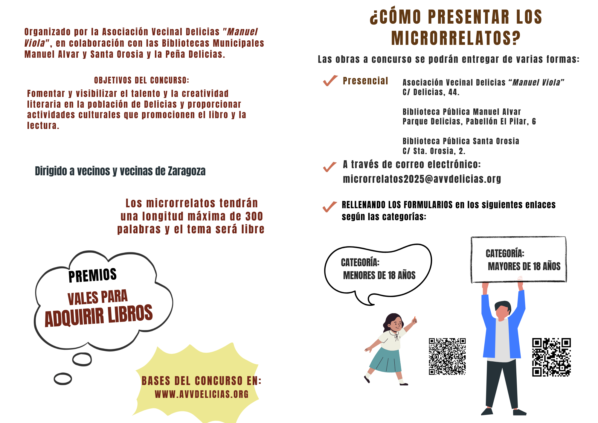 Las obras se entregarán dentro de un sobre grande, con el título en un lugar visible y sin firmar; dentro de este sobre habrá otro sobre pequeño cerrado en cuyo interior se incluirá la Ficha de participante (Anexo1). Se incluirá la ficha de autorización en el caso de participantes menores de edad. (Se adjunta modelo)                   Remitidos por correo electrónico, las obras se entregarán como documento adjunto cuyo nombre será igual al título de la obra, en formato doc/docx, odt o pdf a la dirección siguiente: microrrelatos2025@avvdelicias.org En el mensaje se deberá adjuntar la Ficha del Participante con todos los datos cumplimentados y firmada, constarán el nombre y apellidos, la dirección, el teléfono del autor o autora, un número de documento de identidad y el título del microrrelato. (ANEXO 1). Rellenando el formulario en los siguientes enlaces según la categoría: