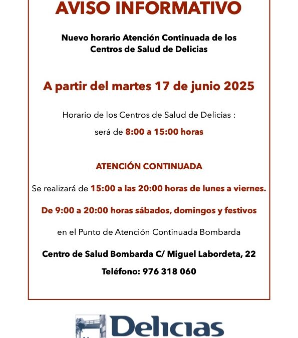 Nuevo Horario Atención Continuada Centros de Salud Delicias